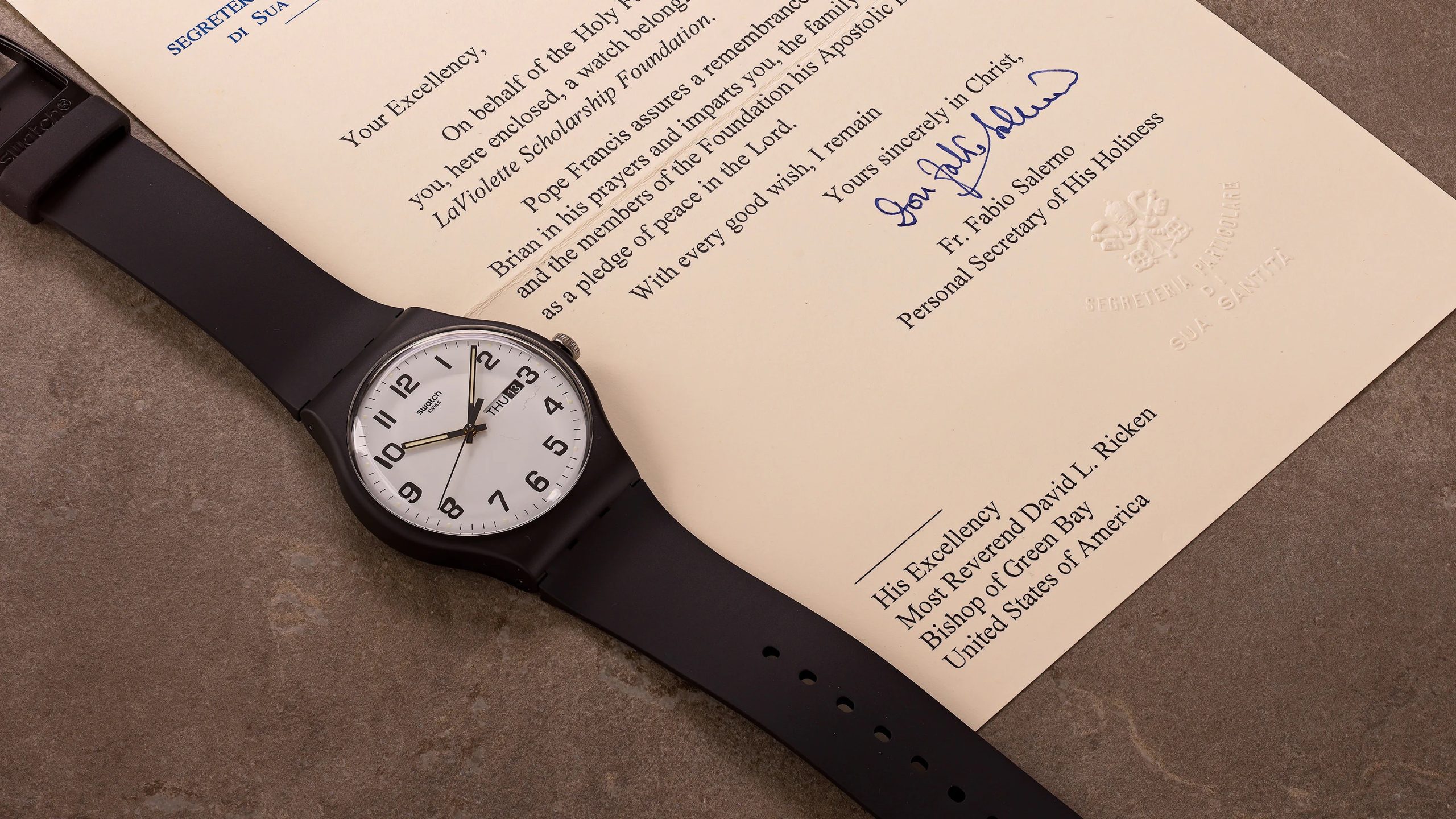 教宗最終捐贈了這只Swatch,並由私人秘書Fabio Salerno神父代筆回信。方濟各的Swatch手錶是2010年款式,石英機芯,塑料錶殼錶帶,34mm,白色面盤,時分秒顯示,得標者將獲得腕錶、錶盒,前述綠灣教區主教和梵蒂岡來往書信。