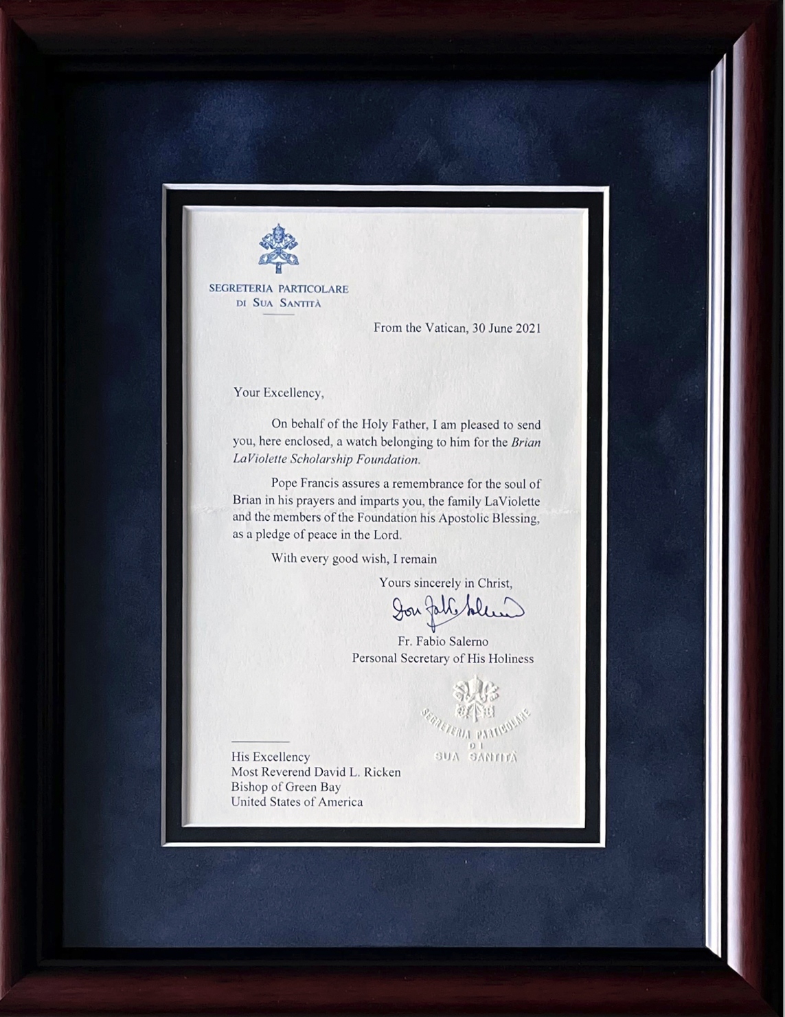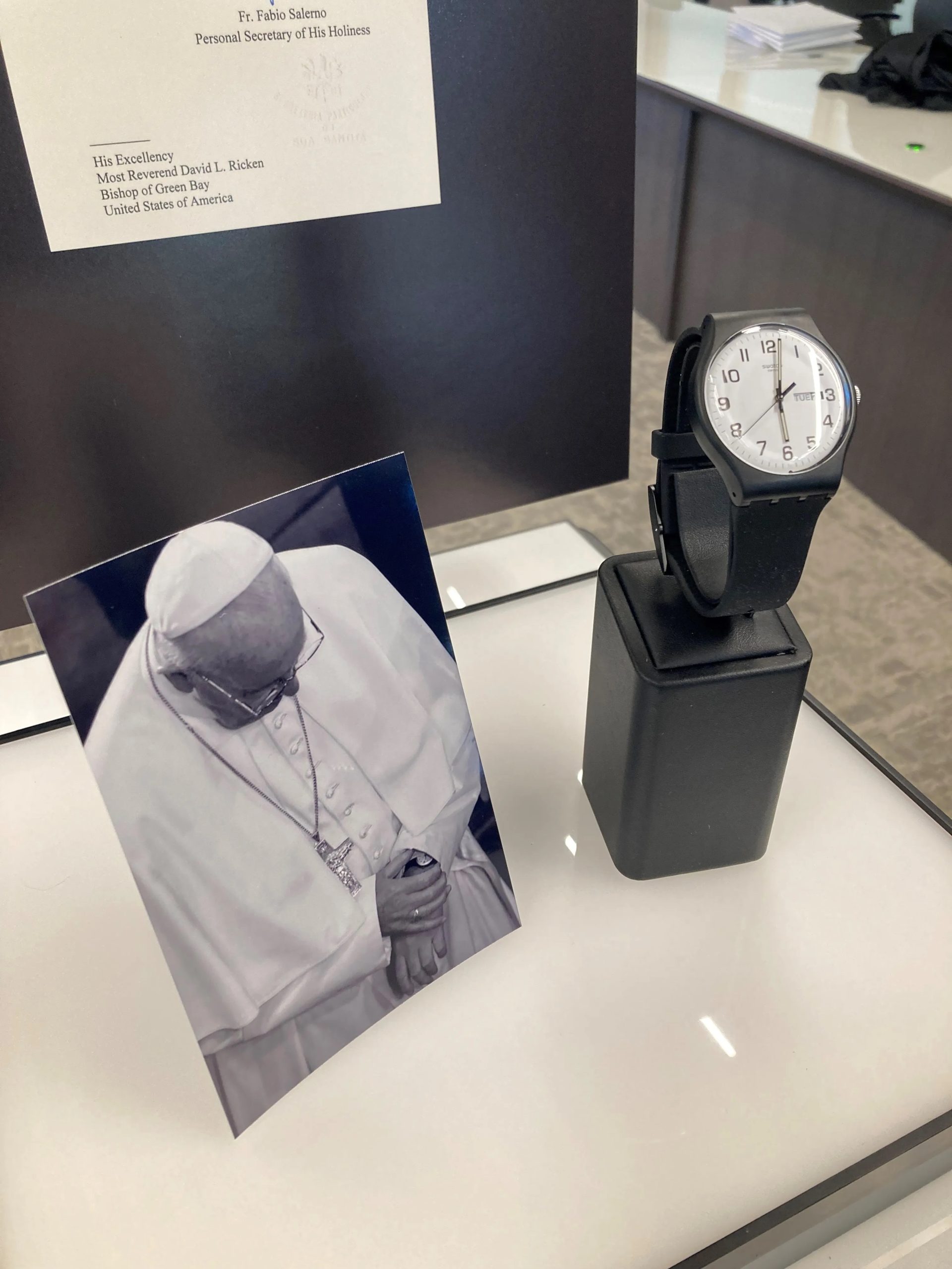 天主教綠灣教區主教David L. Ricken在一封書信裡向方濟各說明慈善拍賣會用意,信中提到「我謙卑地希望,是否能考慮提供一支您曾經戴過的、願意割愛給這場慈善拍賣會,不昂貴且價格親和的手錶。」
