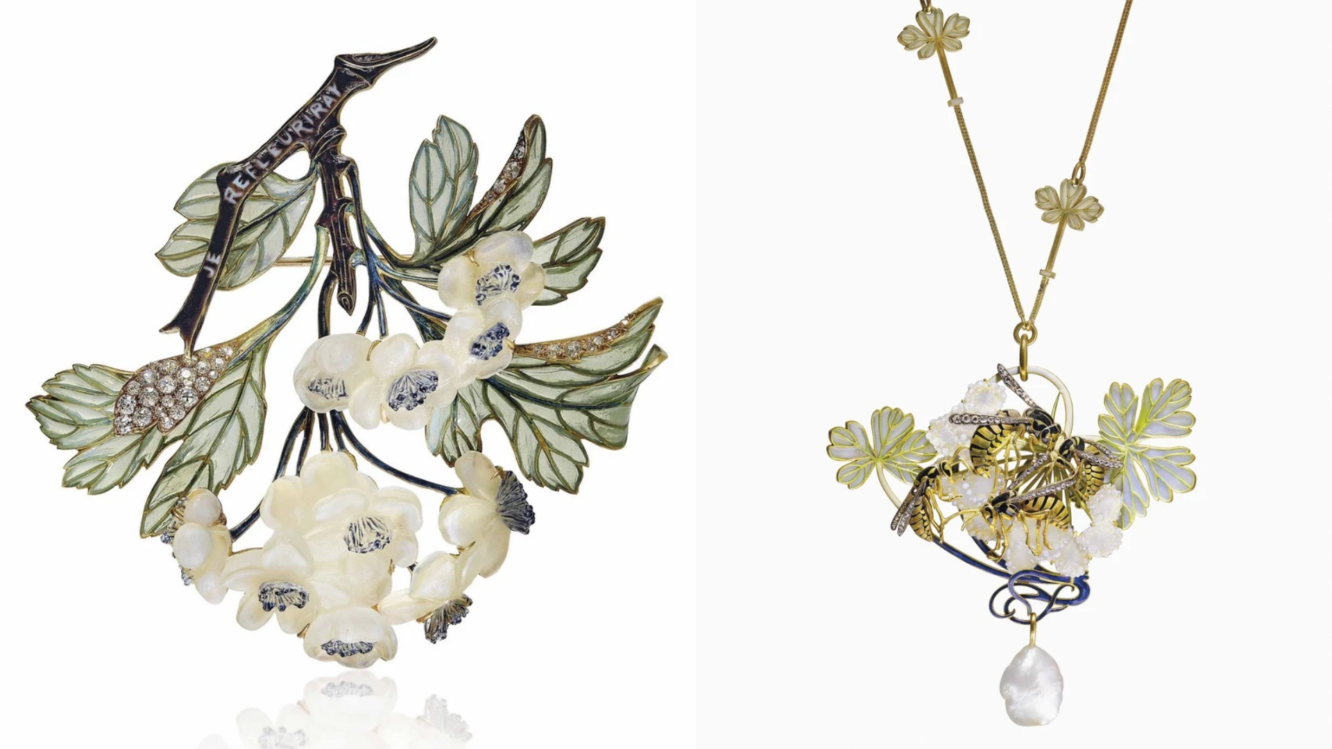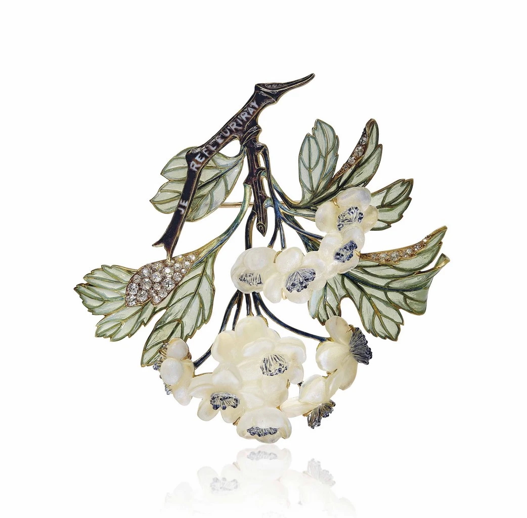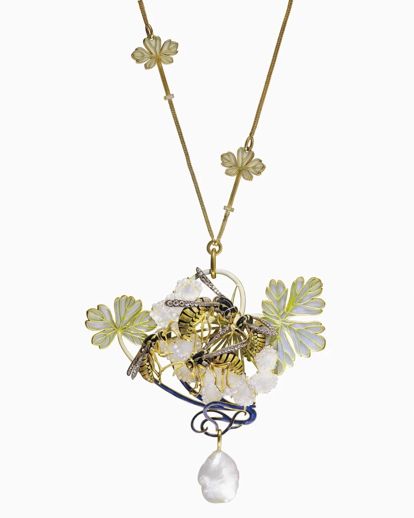 拍品當中有多件Art Nouveau作品,能見René Lalique用玻璃、巴洛克珍珠、彩寶、空窗琺瑯構築草樹繁花、黃蜂舞蝶的情境,並用黑色琺瑯和黑漆,勾勒出動物形體(如黃蜂)和莖葉枝幹,像珠寶裡的炭筆,有了它們細巧的黑色勾勒形體,珠寶作品顯得格外迷人。