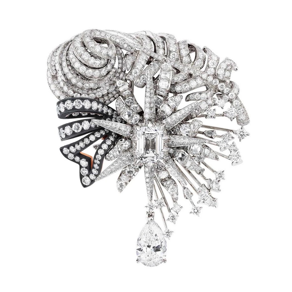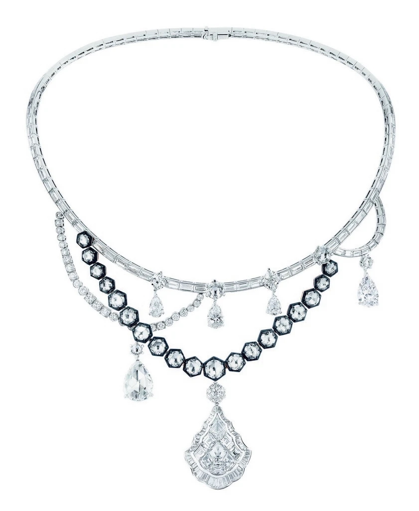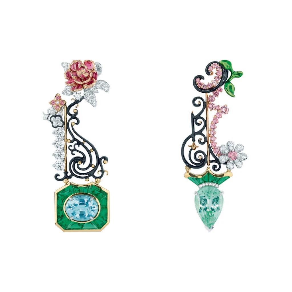 無獨有偶,Dior首位高級珠寶創意總監Victoire de Castellane在2016年【Dior à Versailles】系列以貴金屬、古典玫瑰式車工、水滴形鑽石和各色彩寶,以及大量黑化表層銀質處理塑形的鑽圈,擬仿凡爾賽宮鏡廳、水晶燈、燭台和18世紀宮廷珠寶。2017年凡爾賽宮第二章【Dior à Versailles, Côté Jardins】述說花園祕境,彩寶組構更為狂放,部分作品用上黑色彩漆模擬花架亭台。