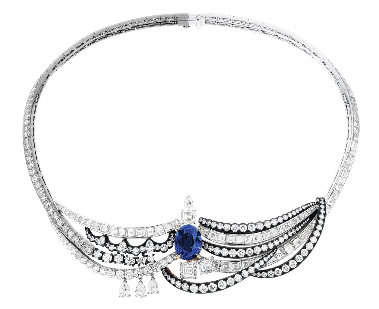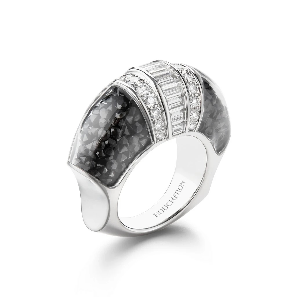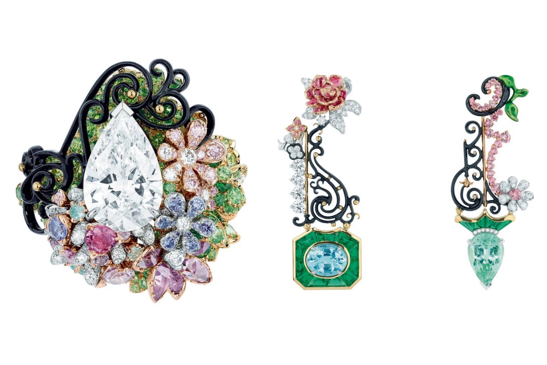 無獨有偶,Dior首位高級珠寶創意總監Victoire de Castellane在2016年【Dior à Versailles】系列以貴金屬、古典玫瑰式車工、水滴形鑽石和各色彩寶,以及大量黑化表層銀質處理塑形的鑽圈,擬仿凡爾賽宮鏡廳、水晶燈、燭台和18世紀宮廷珠寶。2017年凡爾賽宮第二章【Dior à Versailles, Côté Jardins】述說花園祕境,彩寶組構更為狂放,部分作品用上黑色彩漆模擬花架亭台。