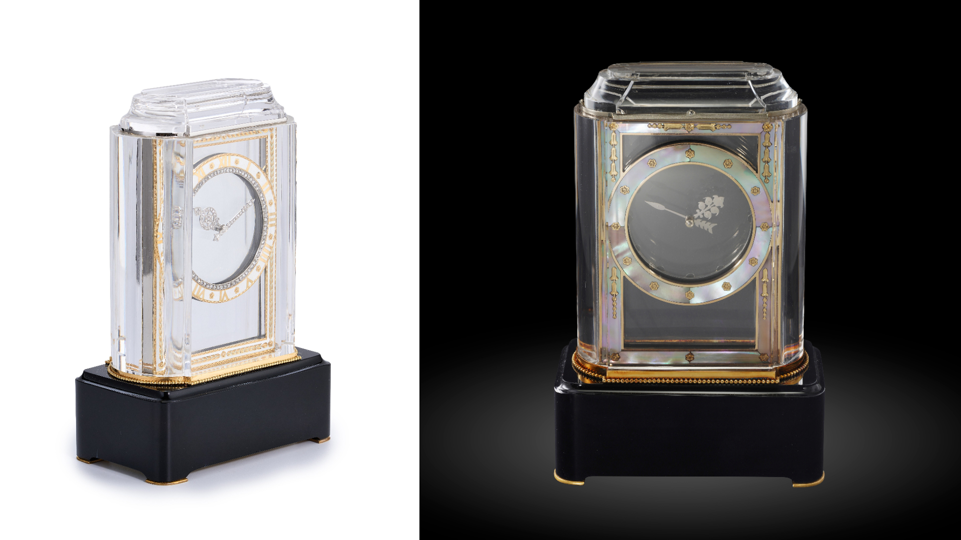神祕鐘(mystery clock)歷史追溯自19世紀「現代魔術之父」Jean Eugène Robert-Houdin(1805-1871)的表演天才。他是一位魔術師,也是一位鐘錶匠,還會製造活動偶和各種微型機械,常將機械天賦應用在魔術表演。神祕鐘的誕生,是Robert-Houdin巧妙把指針固定在透明水晶玻璃碟盤上,藉由夾板外緣齒輪推動,營造出指針懸浮、卻不見任何機械齒輪的幻象效果。19世紀末至20世紀初美好年代(Belle Epoque),Louis Cartier受到Robert-Houdin靈感啟發,相請鐘錶大師Maurice Coüet合作,在1912年打造出卡地亞第一款神祕鐘Model A(Modèle A),六面體對稱水晶鐘罩,清麗雅緻的鐘體,開啟鐘錶時計裝飾藝術風格先河,後由美國金融家J.P.摩根(John Pierpont Morgan)購藏。神祕鐘早年都是皇室或富豪的「高單價訂製禮」,例如英國瑪麗王后在1924年便曾收到一座神祕鐘當禮物,1945年戴高樂也曾訂製一座送給史達林。全球僅製作約60件作品中,據悉少於5件採用瑪瑙底座。